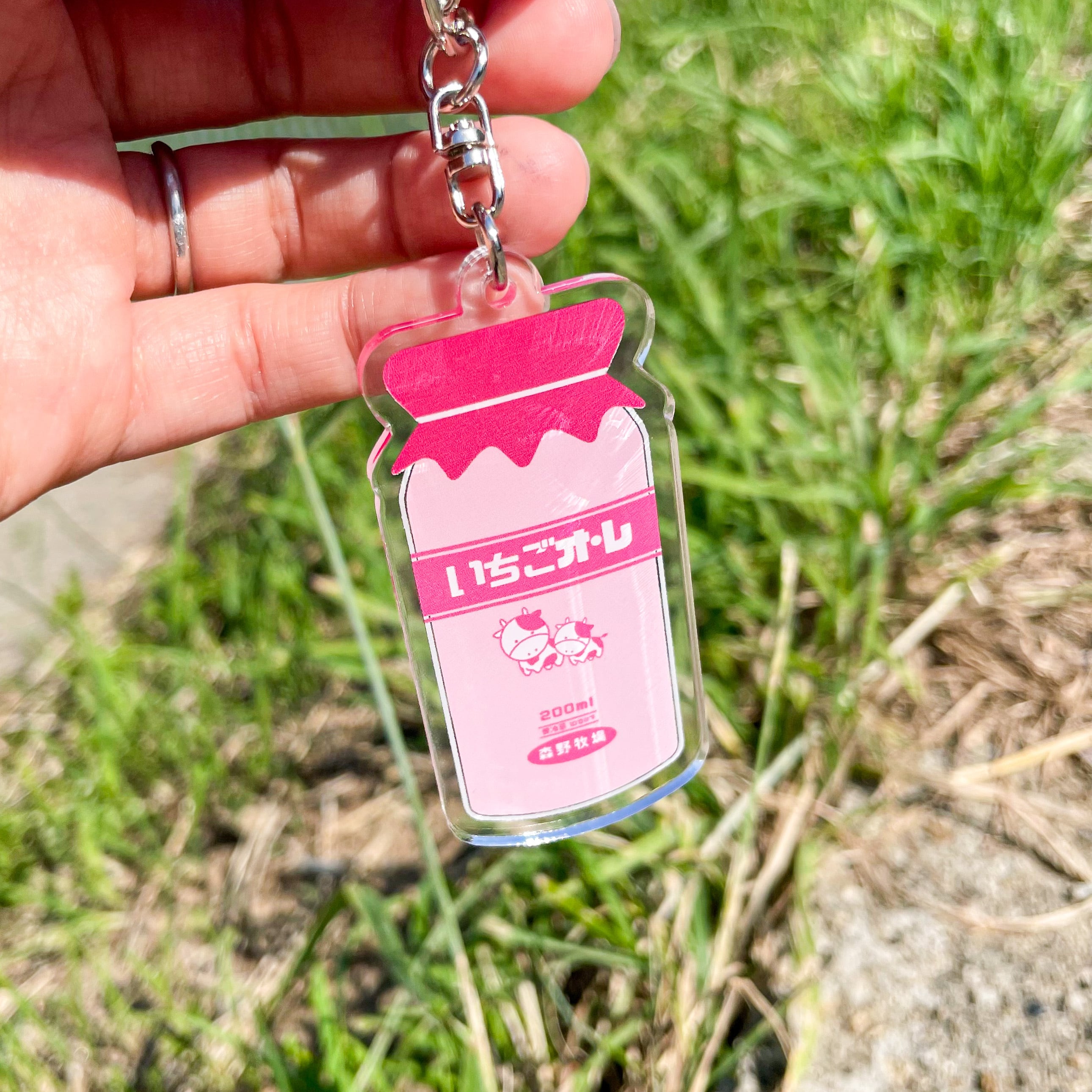 森野牧場のいちごオレをアクリルキーホルダーにしました。