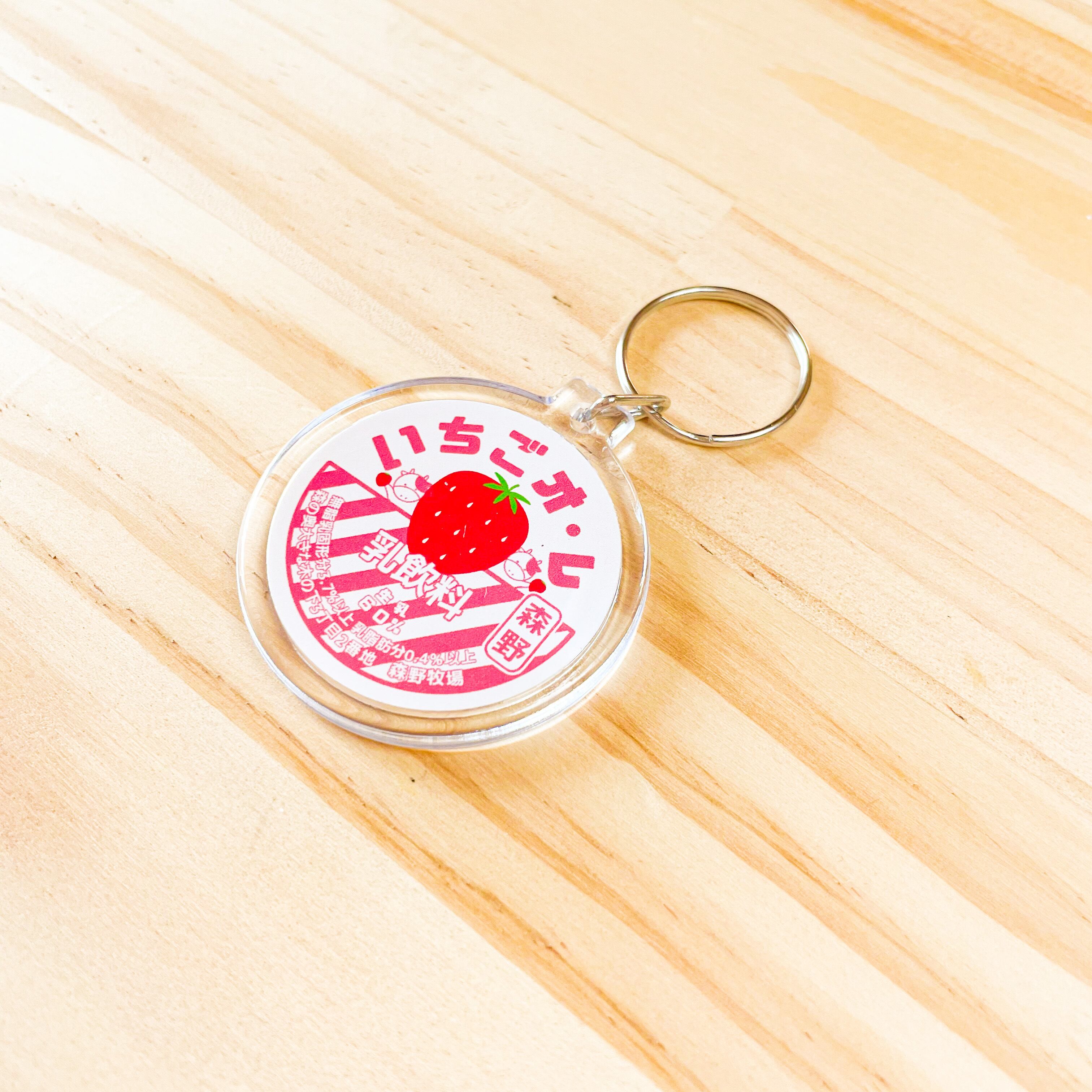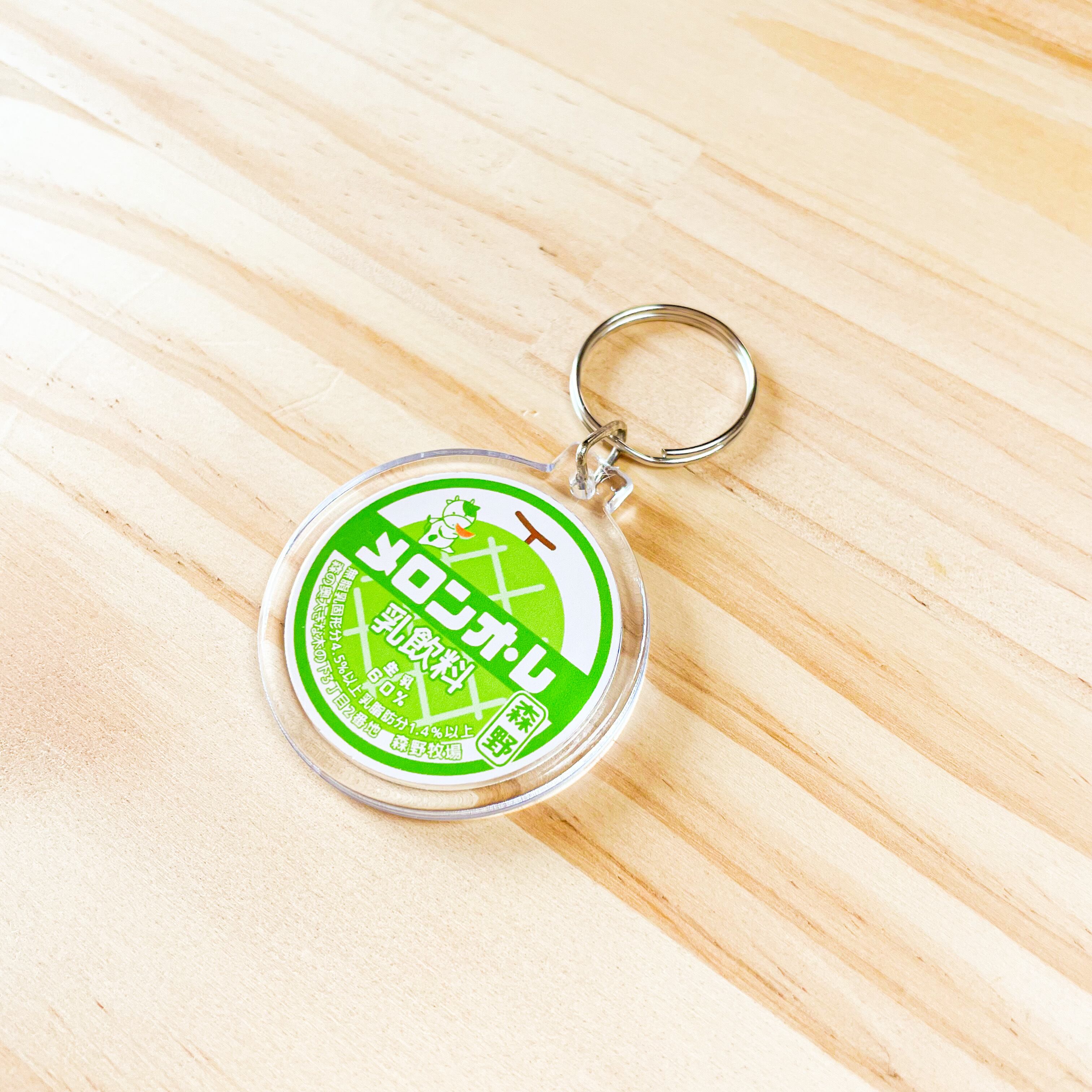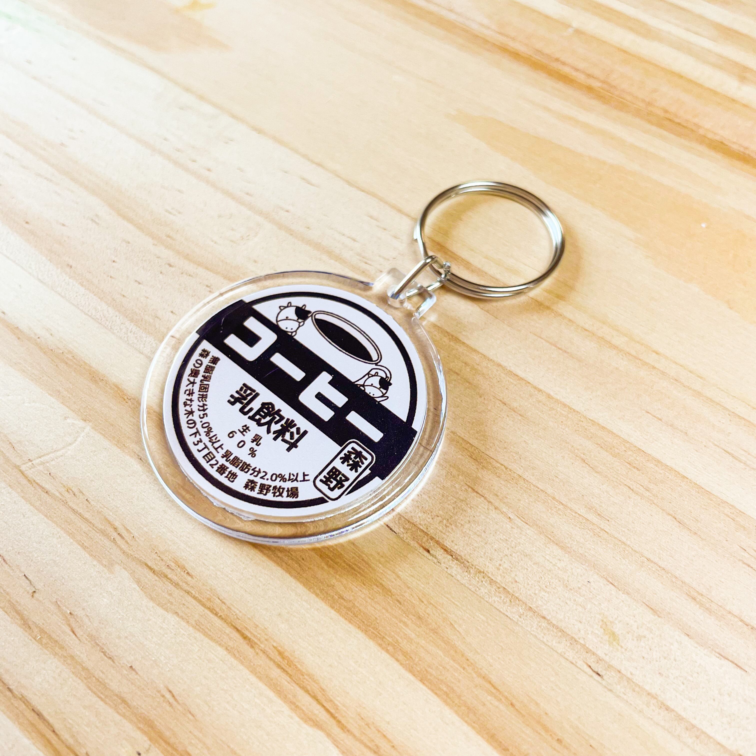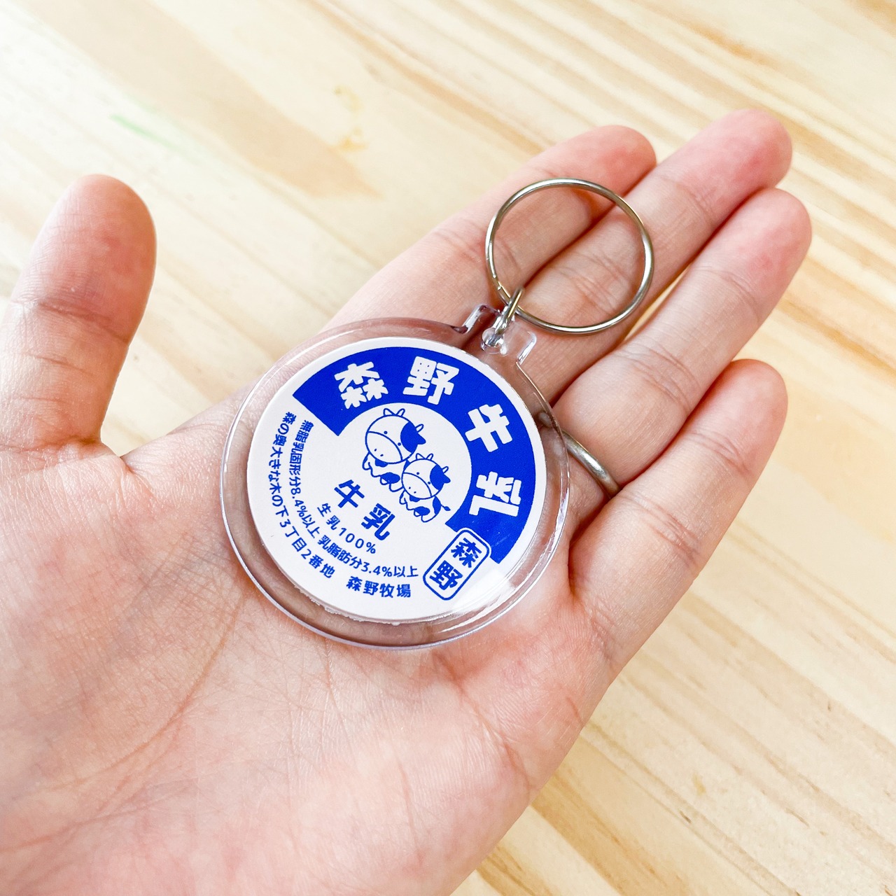 牛乳瓶の蓋を挟み込んだようなレトロなキーホルダーです。